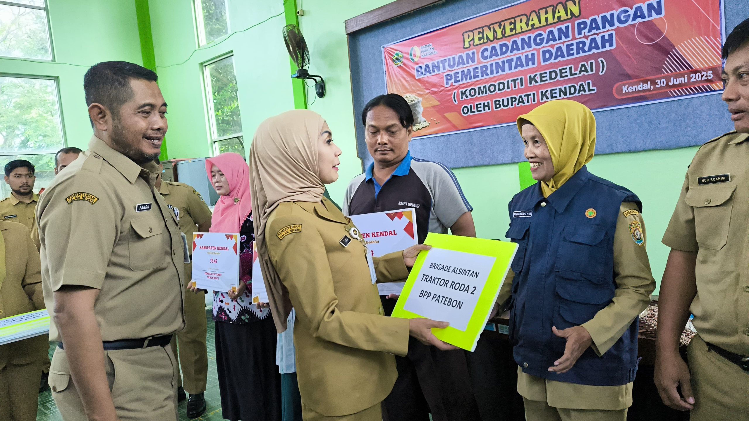 Selain bantuan kedelai, Dinas Pertanian dan Pangan Kendal juga menyerahkan sejumlah alat pertanian modern seperti combine, power thresher, rice transplanter, dan traktor roda dua kepada kelompok tani di sentra padi.