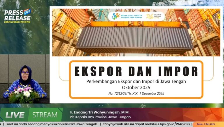 Pelaksana tugas (Plt) Kepala BPS Jateng, Endang Tri Wahyuningsih, menjelaskan bahwa total ekspor pada periode tersebut mencapai 10.321,91 juta dolar AS. Sementara itu, ekspor pada Oktober 2025 saja mencapai 1.123,60 juta dolar AS, atau naik 11,48 persen dibanding Oktober 2024.